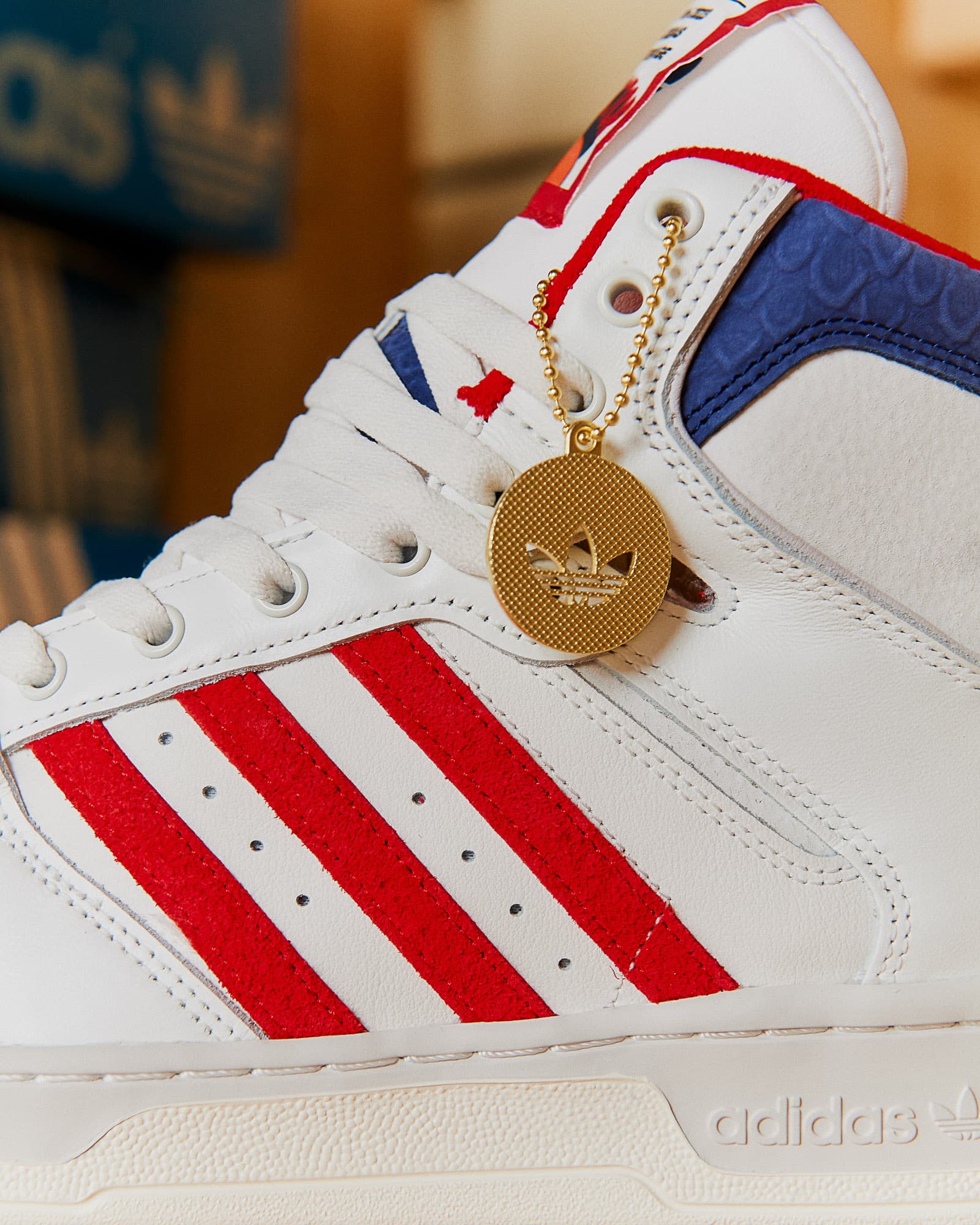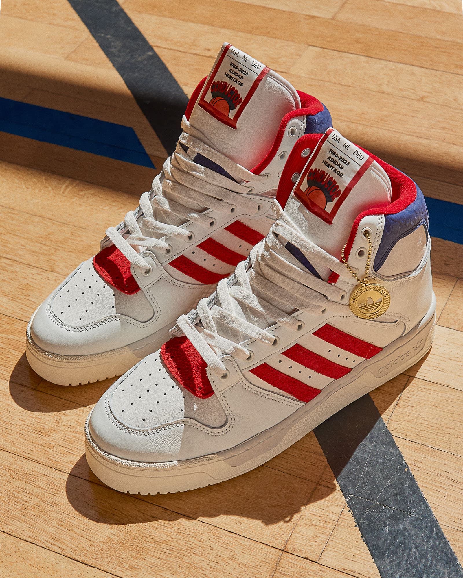 Het tweede silhouet, de adidas Conductor Hi in de colorway ‘Scarlet’, heeft een wit met blauw en rode colorway – een knipoog naar het NBA-seizoen van ’79 toen de Knicks hun teamkleuren veranderden. De sneaker heeft een op een game ticket geïnspireerd tonglabel en een bovenwerk van volnerfleer.