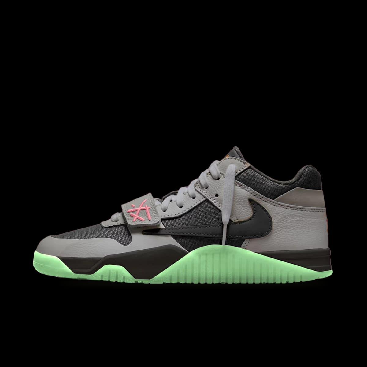De colorway komt met een zwart-grijze upper en een glow-in-the-dark groene buitenzool, verpakt in een speciale box. Voor de eerste release houden Scott en Chase B het dicht bij huis. Deze week wordt er een raffle gehost in Space Village, Houston, waar beide artiesten vandaan komen.