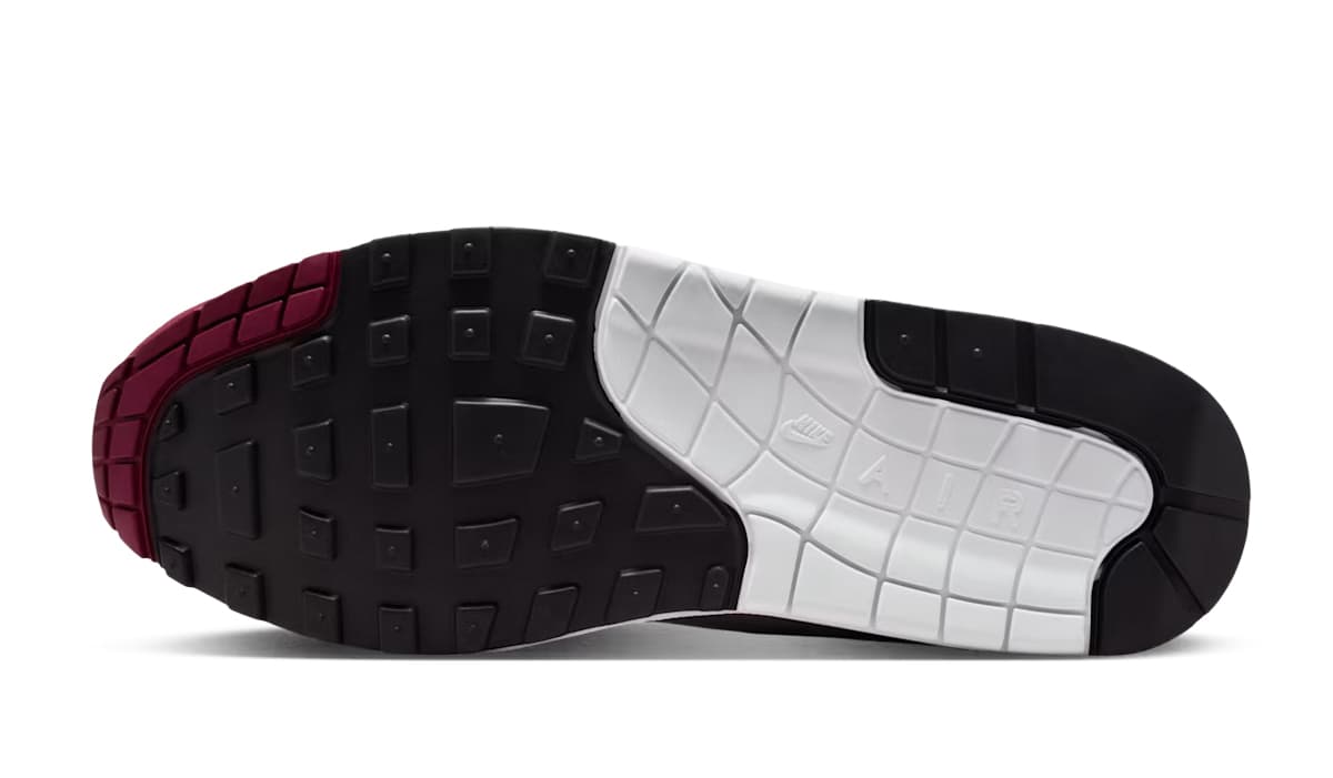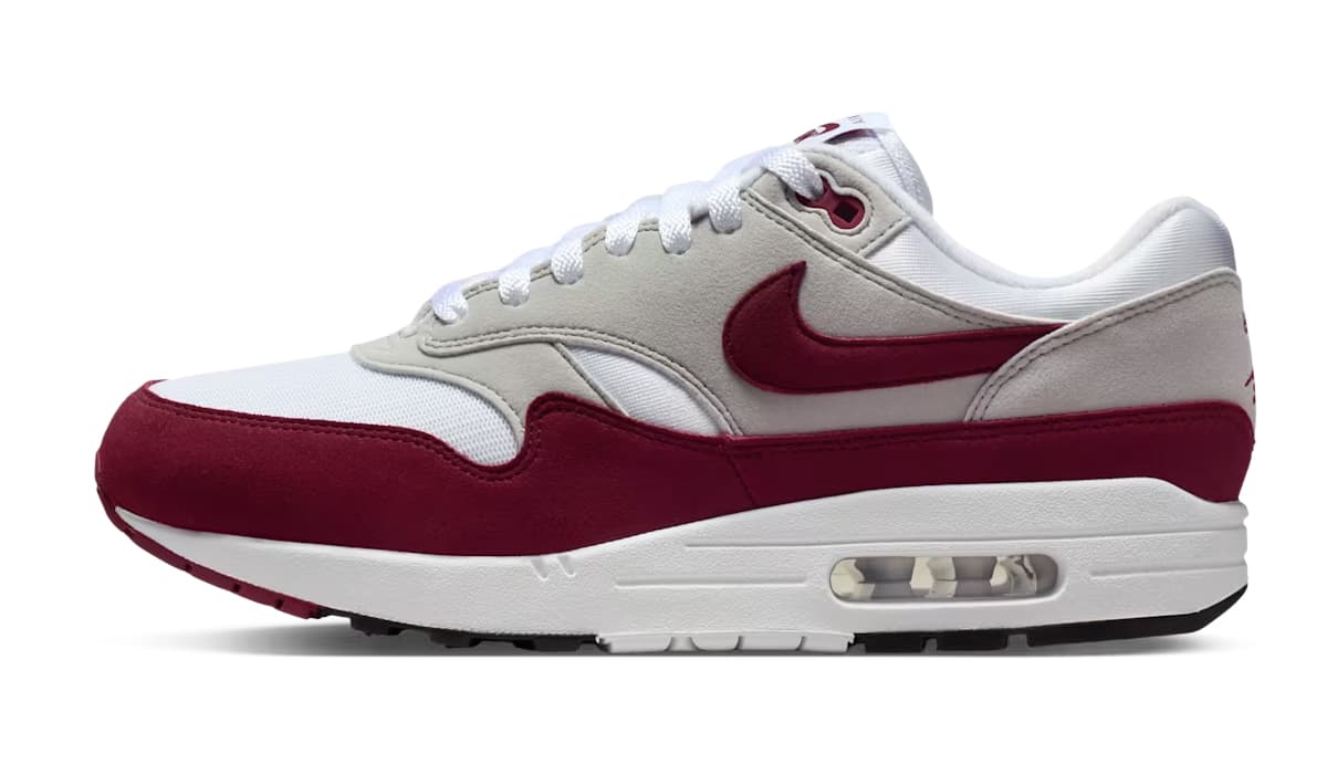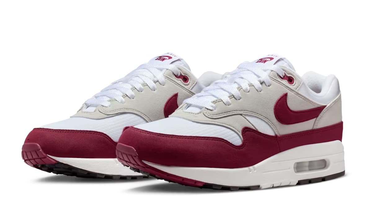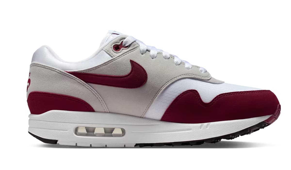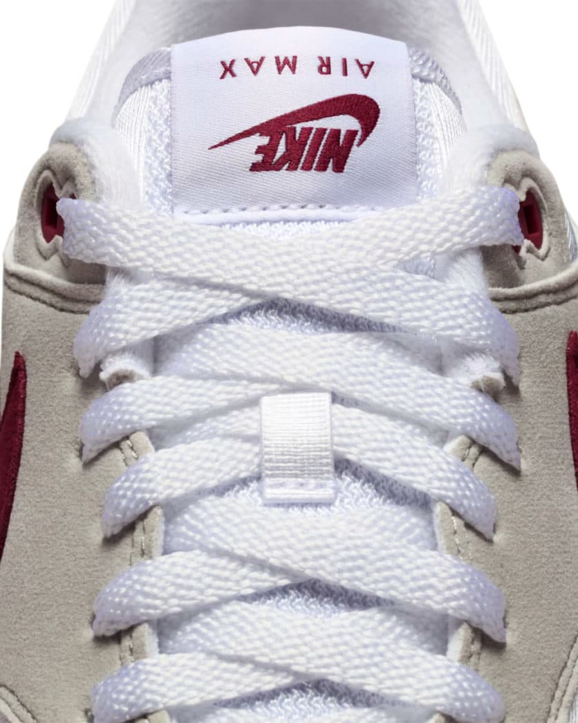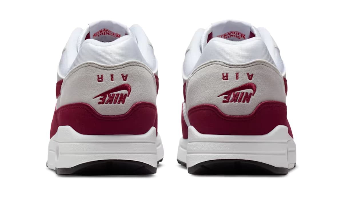 De Air Max 1 komt voor deze samenwerking in een ‘Team Maroon’ colorway, verwerkt in de verder klassieke colorblocking. Wit mesh en grijze overlays vormen de basis, terwijl ‘Maroon’ de mudguard en de details op de sneaker zijn flare geven. De omgedraaide Nike-branding op de tong en hak verwijst naar ‘The Upside Down’, één van de herkenbare elementen uit de serie.